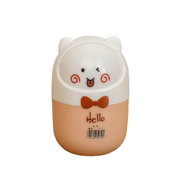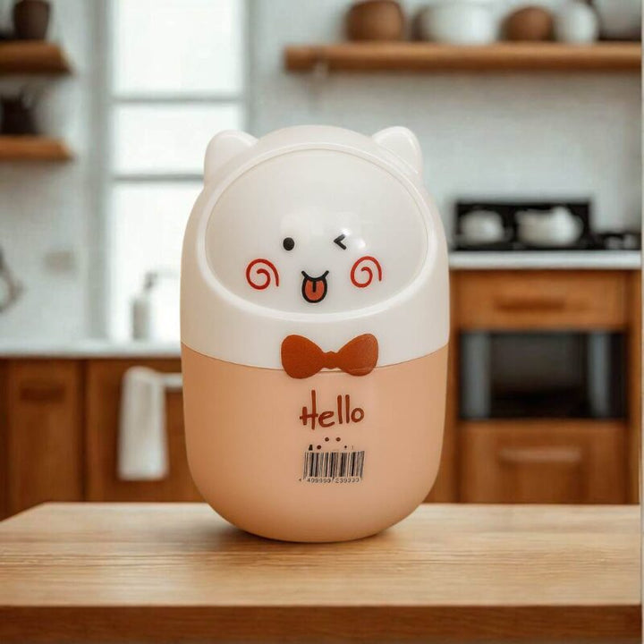 Design : Forme arrondie avec motif “Hello”, nœud papillon et visage expressif