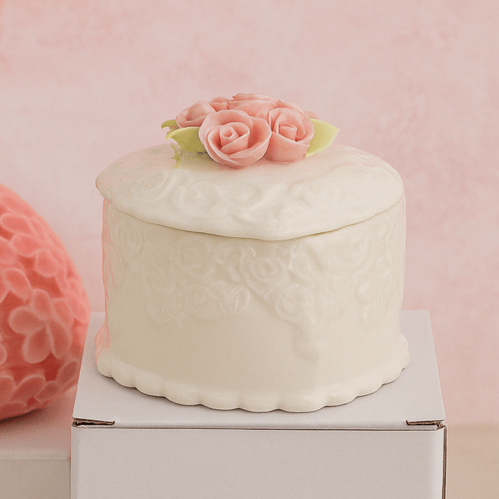 Ajoutez une touche romantique et vintage à votre intérieur avec cette adorable boîte décorative en résine, finement travaillée en forme de petit gâteau glacé. Ornée de délicates roses roses sur le couvercle, elle est idéale pour ranger vos petits trésors avec élégance.