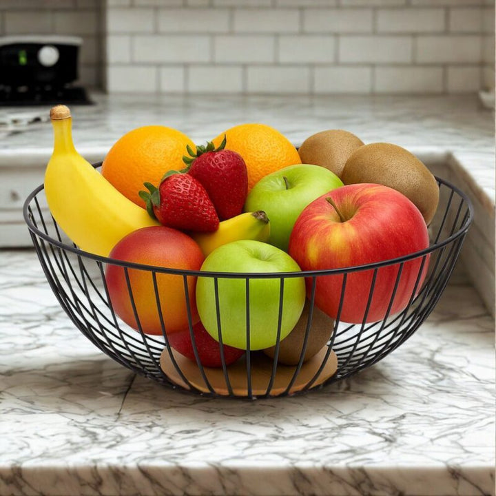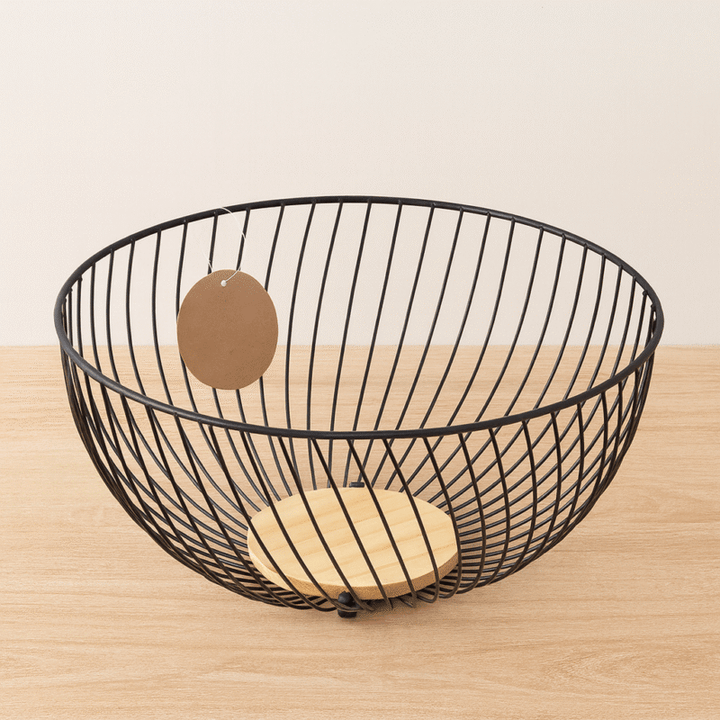 Apportez une touche contemporaine et naturelle à votre cuisine avec cette corbeille à fruits au design filaire noir, subtilement relevée par un fond effet bois. Élégante et fonctionnelle, elle met en valeur vos fruits tout en laissant circuler l’air pour une meilleure conservation.