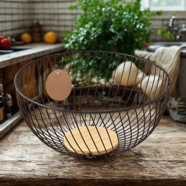 Corbeille à Fruits Noire – Design Filaire & Fond Bois 25 x 10 cm