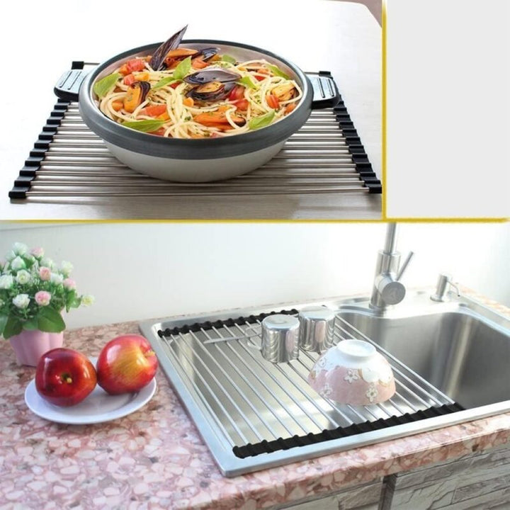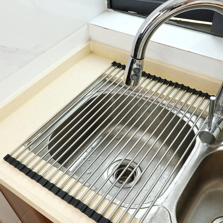 Ajoutez une touche d’élégance et de fonctionnalité à votre cuisine avec l’Égouttoir à Vaisselle Enroulable Pliable en Acier Inoxydable.