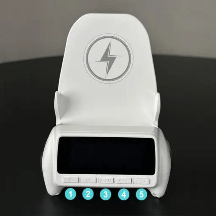 Transformez votre table de chevet ou bureau avec ce réveil multifonction moderne. Ce dispositif 4-en-1 combine une horloge élégante, une alarme, une station de charge sans fil et une enceinte Bluetooth pour répondre à tous vos besoins quotidiens dans un design compact et pratique.