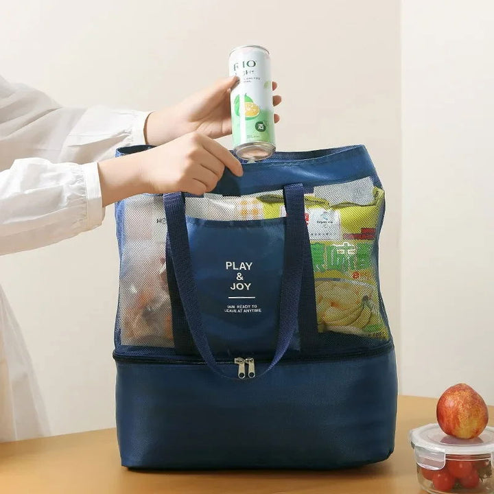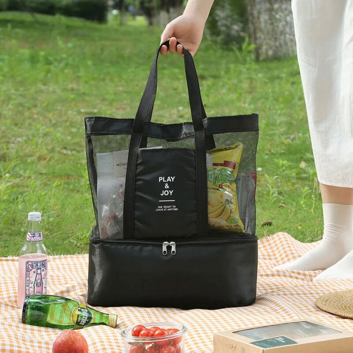 Emportez tout ce qu’il vous faut pour une journée parfaite à la plage ou au parc avec ce sac de plage multifonction 2-en-1, alliant un grand compartiment en filet aéré et une base isotherme zippée pour garder vos boissons et en-cas bien au frais.