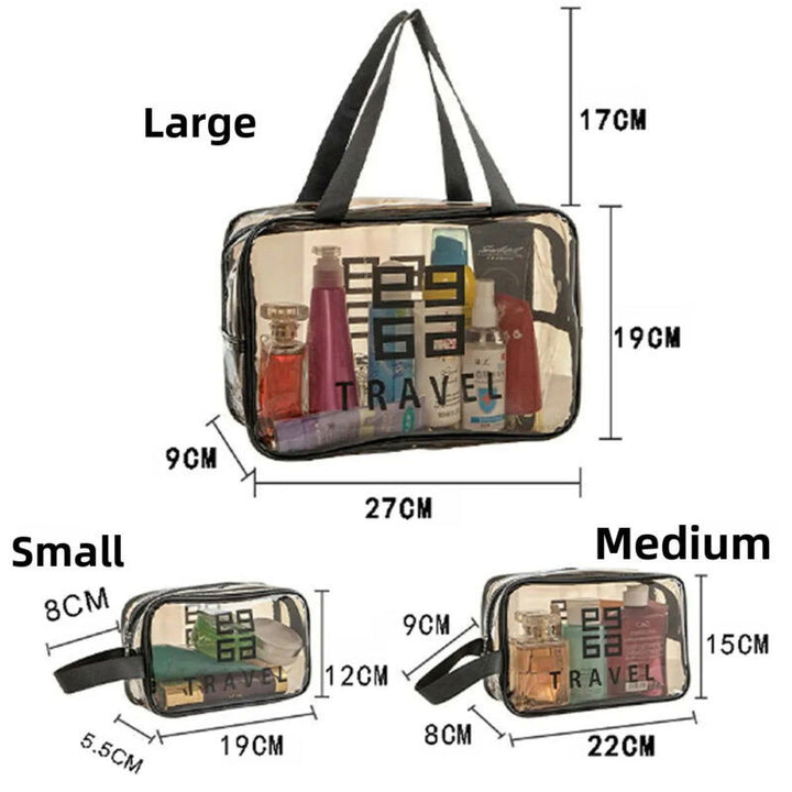 👜 Set de 3 trousses transparentes : Small (19×12×5,5 cm), Medium (22×15×8 cm), Large (27×19×9 cm)